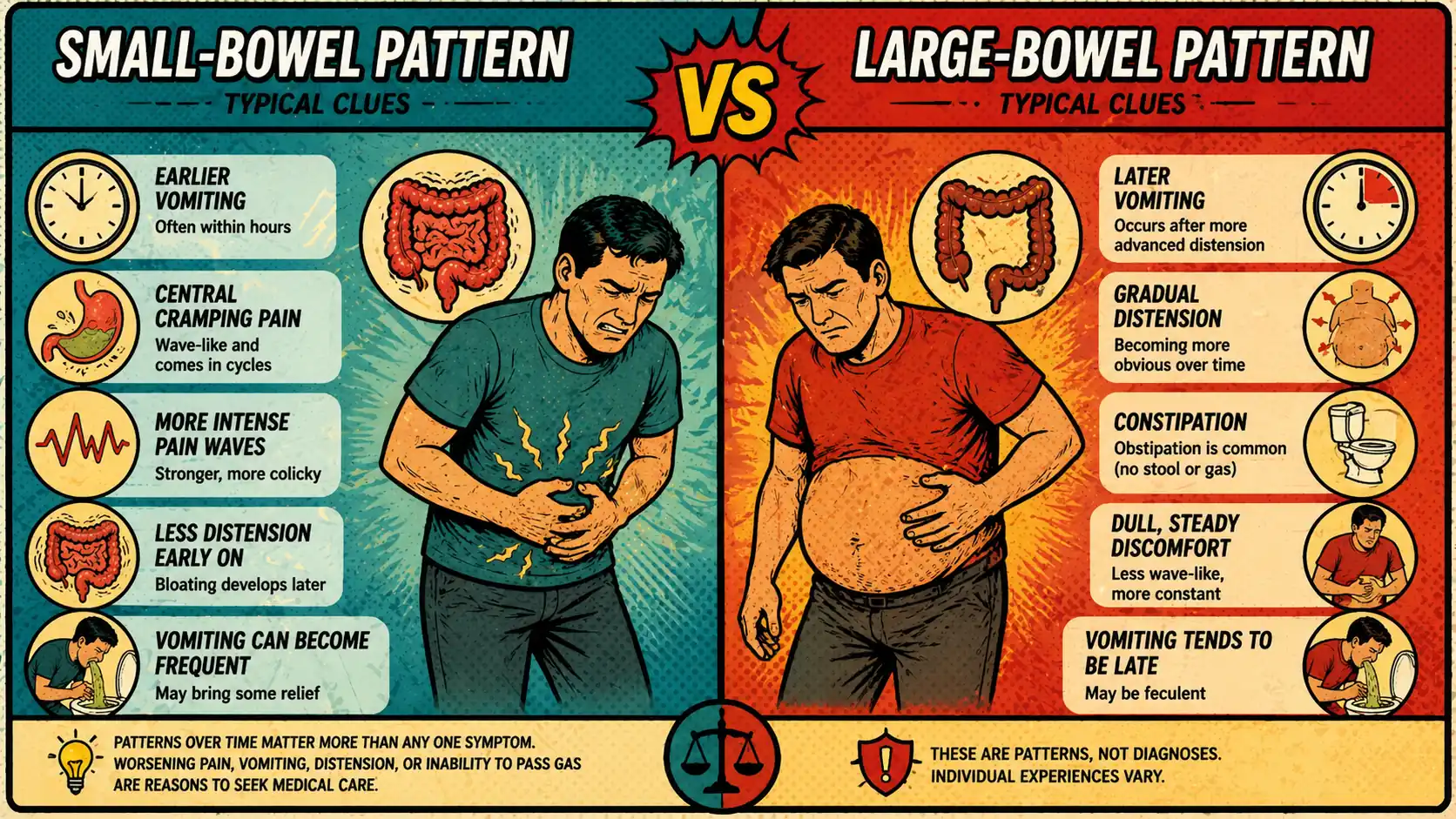 | Pattern | Small-bowel obstruction often looks more like | Large-bowel obstruction often looks more like |