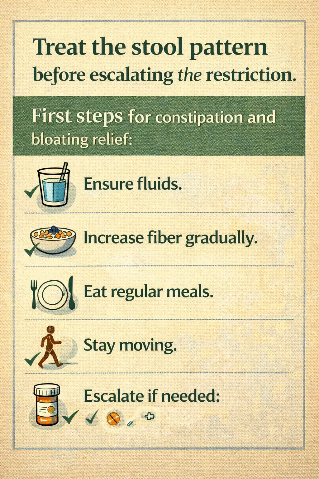 The main point is not to make you over-analyze every day. It is to stop using food restriction as the default answer before the constipation pattern has even been addressed.