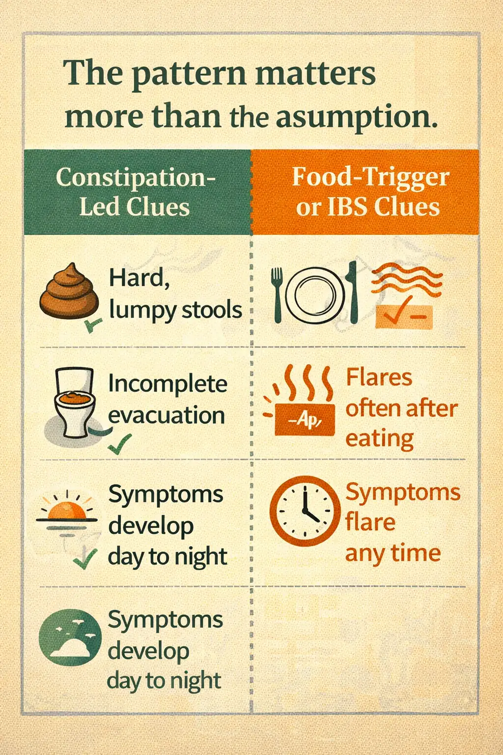 It means this: if stool is hard to move, incomplete, or inconsistent, the bowel pattern deserves attention before you assume every flare is coming from one "wrong" food.