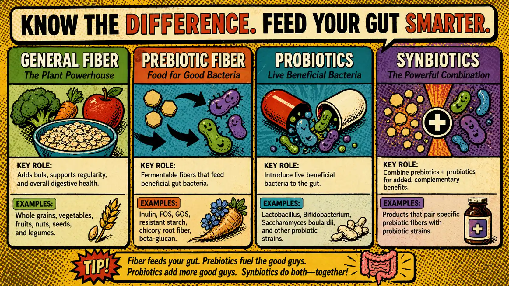 | General fiber | broad group of nondigestible carbohydrates and related compounds | oats, psyllium, vegetables, legumes | stool bulk and broader digestive support | not all fiber is automatically prebiotic |