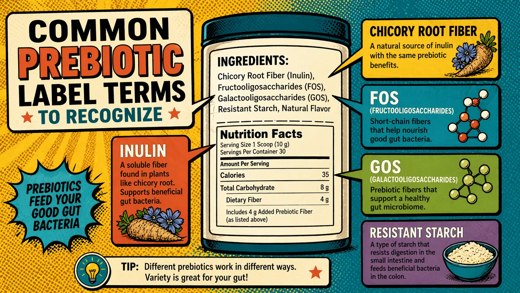 [!TIP] Download: Prebiotic Ingredient Label Checklist Keep this nearby when you compare inulin, chicory root fiber, FOS, GOS, and other 'gut support' label language.