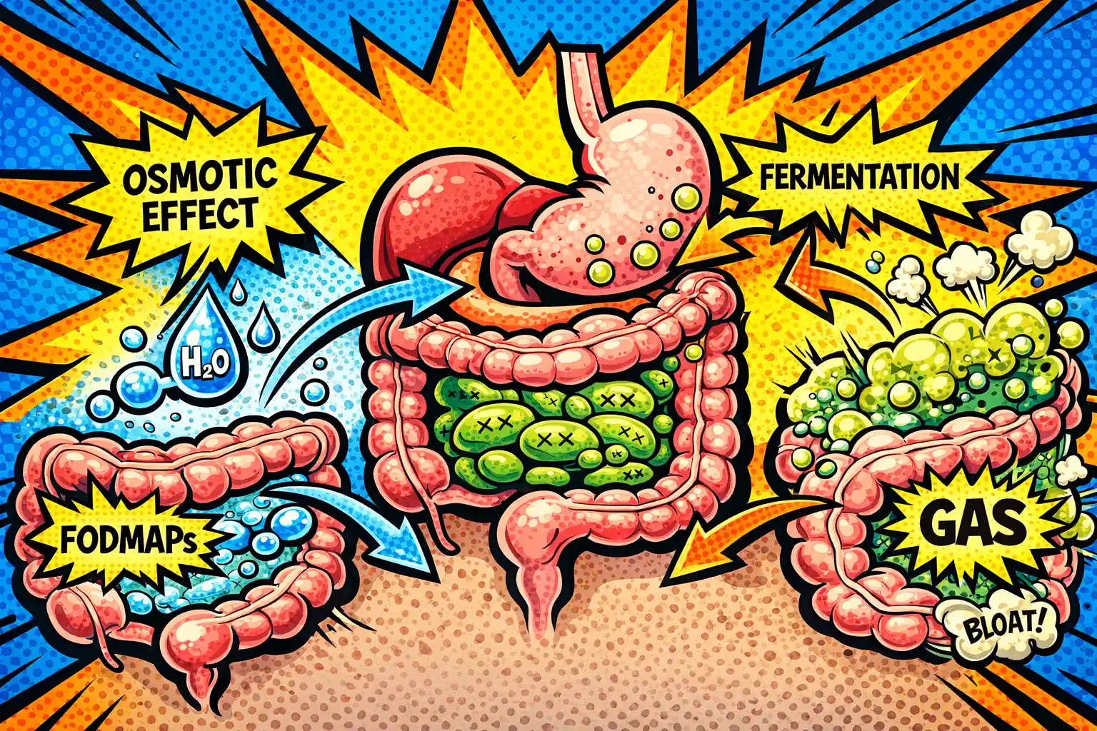 Rapid fermentation – When unabsorbed FODMAPs reach your colon, gut bacteria feast on them and produce gases (hydrogen, carbon dioxide, methane) 8. Unlike slow-fermenting fiber, FODMAPs ferment fast – causing quick gas buildup that distends your belly.