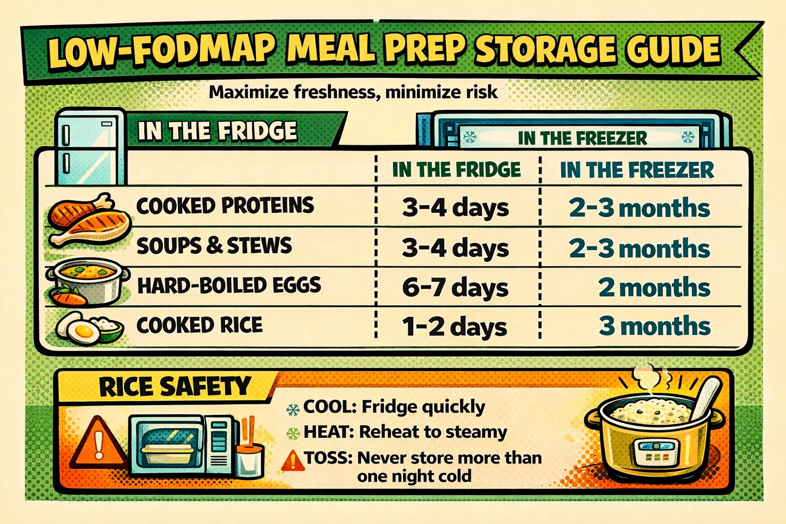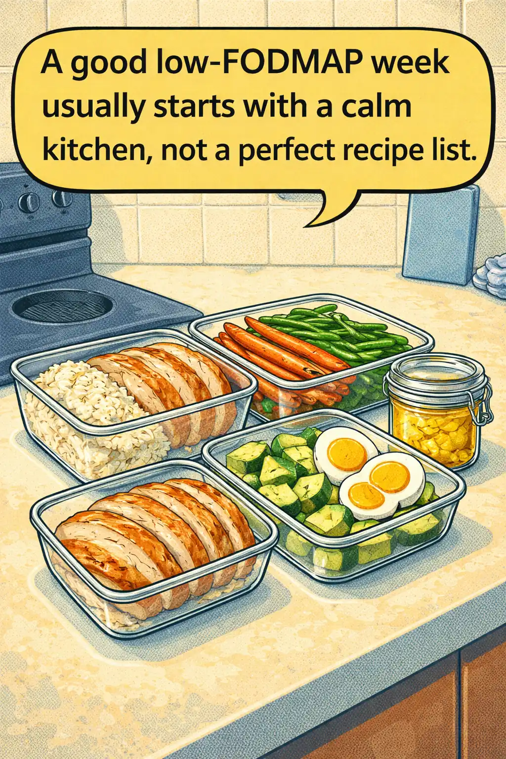 Low-FODMAP meal prep does not need to be elaborate. One batch-cook session, one midweek refresh, and a few clearly portioned staples can remove a lot of the decision fatigue that makes the diet harder than it needs to be.