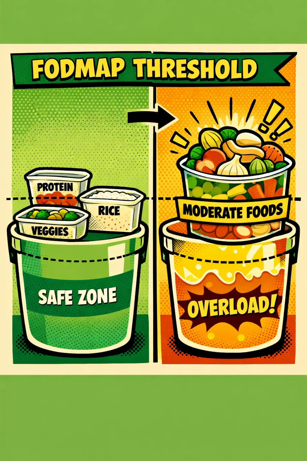 Think of your FODMAP threshold like a bucket. Each ingredient adds a little water. A meal-prep container that already includes several moderate foods can fill the bucket before you even add a snack.