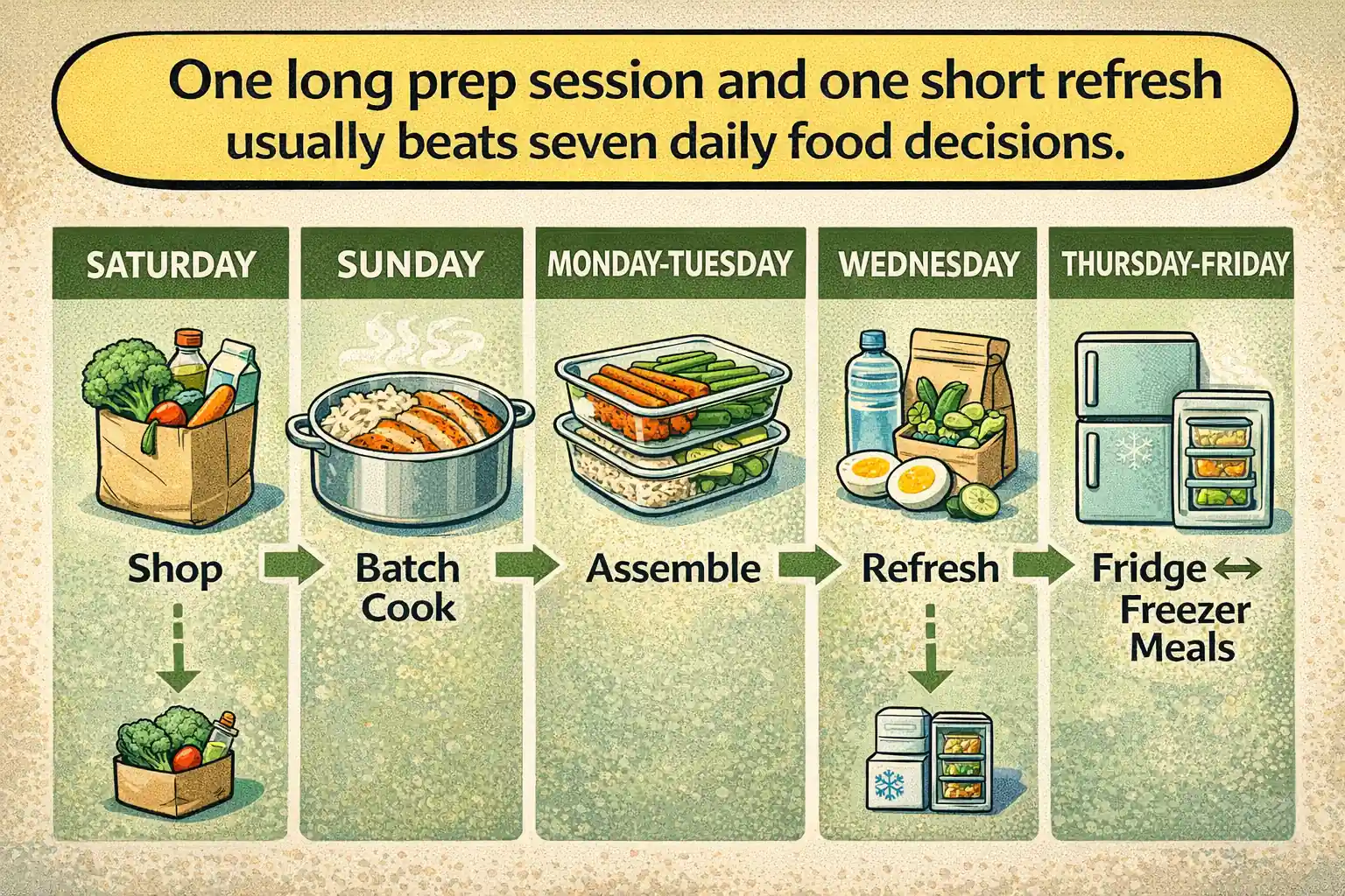 - Sunday: one main batch-cook session, about 90 minutes to 2 hours