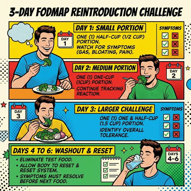 For example, if you are testing lactose, choose one lactose-containing food and increase the serve over 3 days while leaving everything else steady. You are not "seeing what happens if I eat normally again." You are running a controlled test.