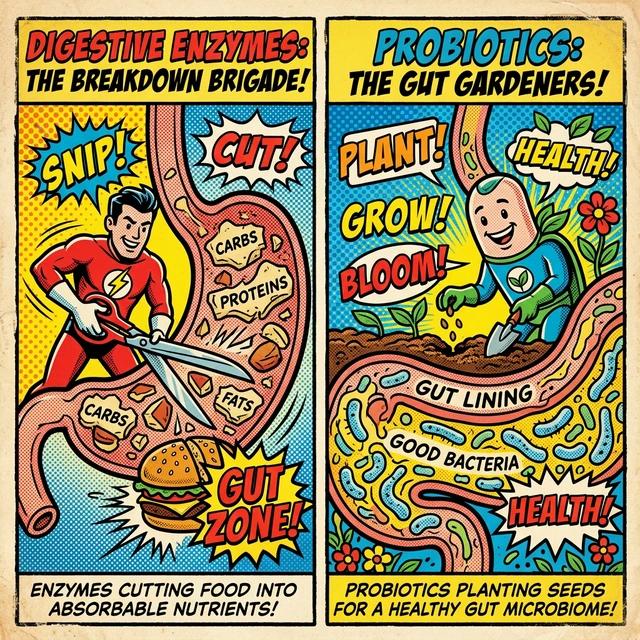 It is important to note that unlike digestive enzymes which provide immediate, meal-by-meal relief, probiotics work gradually by rebalancing your entire gut ecosystem.