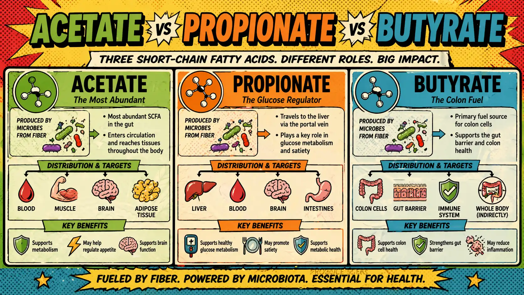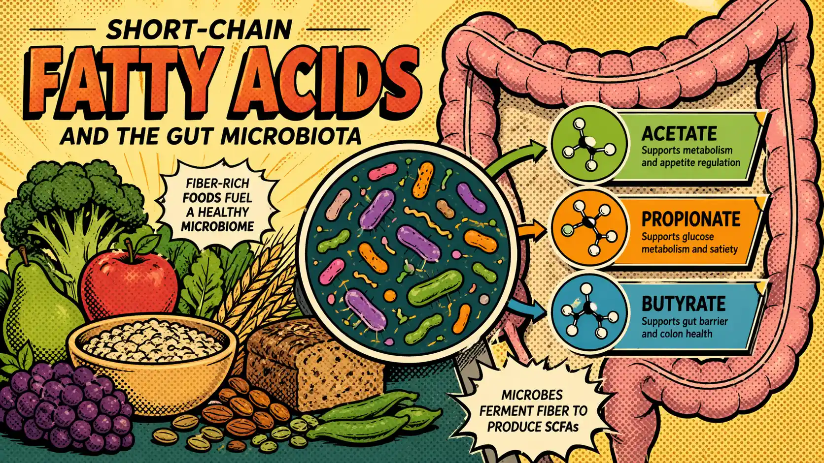 - Acetate, propionate, and butyrate help explain why fiber, prebiotics, and microbial ecology matter.
