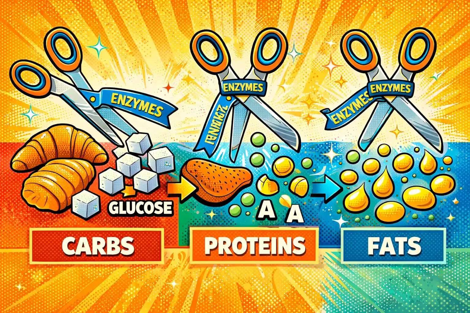 Digestive enzymes are proteins your body makes to break down carbs, proteins, and fats2. They act like scissors, cutting food into smaller pieces for absorption.