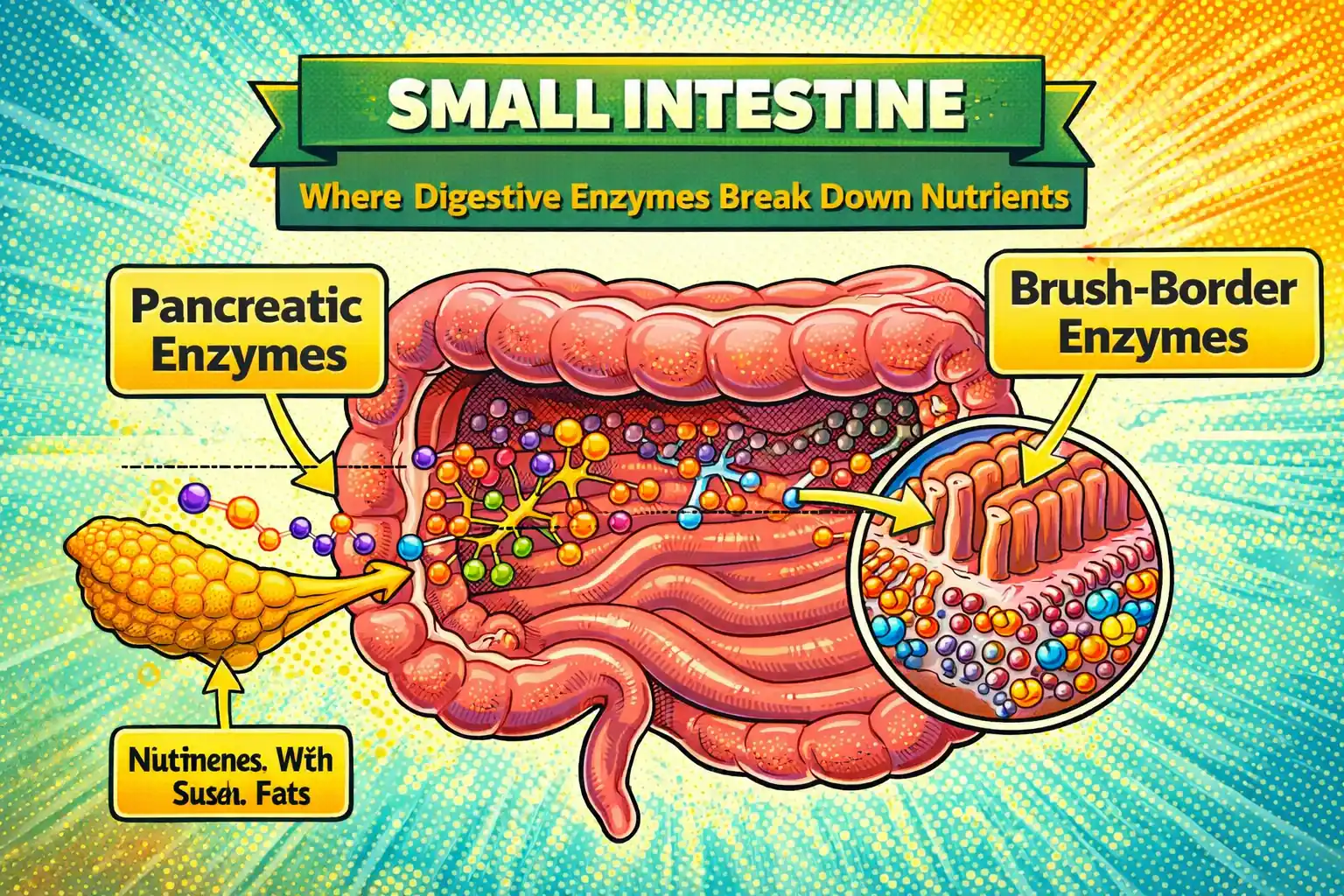 The small intestine is where enzymes do most work22. Pancreatic enzymes act here. The intestinal lining produces brush-border enzymes like lactase, maltase, and sucrase. Proper breakdown prevents undigested food from reaching the colon where bacteria ferment it into gas.